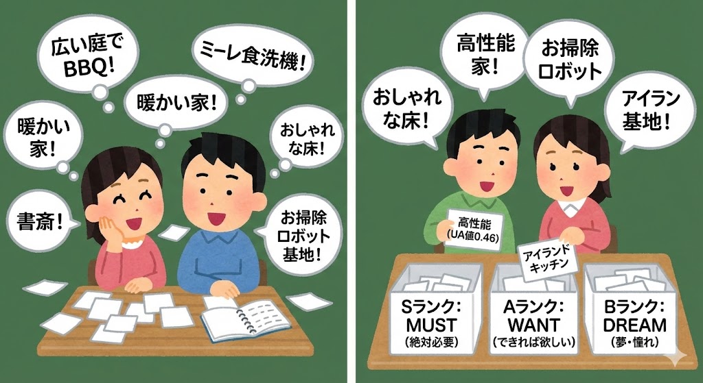 そうならないための唯一の解決策。 それは、プロ(住宅会社)と会う前に、自分たちの要望を整理した「要望シート」を作ることです。 今回は、予算を守りながら家族全員が納得するための「優先順位の決め方」を4つのステップで解説します。