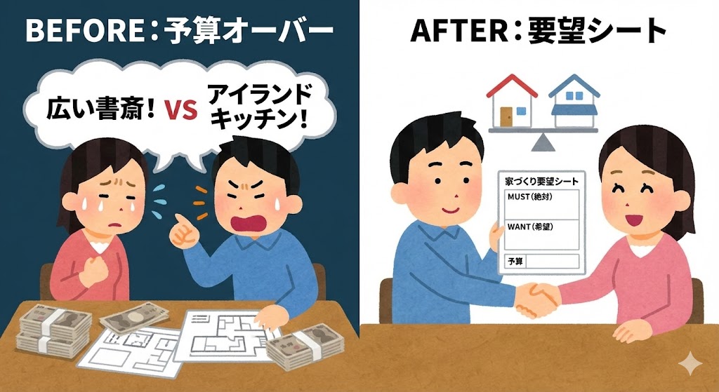 要望シートを作っていると、必ず夫婦で意見が対立します。 「俺は書斎が欲しい(Sランク)」vs「私はパントリーが欲しい(Sランク)」 どちらも譲れない場合、どうするか。