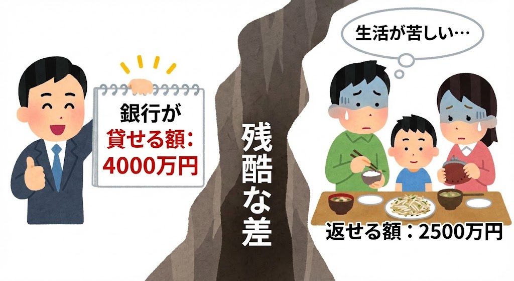 銀行が「貸してくれる金額」と、あなたが無理なく「返せる金額」は、全く別物です。 具体的には、500万円〜1,000万円ほどのズレがあると考えてください。