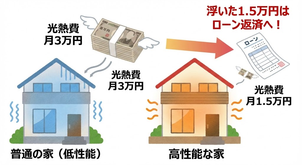 つまり、浮いた光熱費(月1〜1.5万円)を、住宅ローンの返済に充てることができるのです。