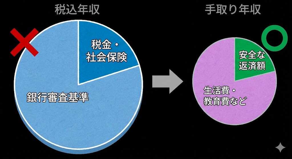 銀行の審査は、基本的に「税込年収(額面)」で行われます。 しかし、実際に私たちが生活に使っているのは、税金や社会保険料が引かれた後の「手取り年収」ですよね。