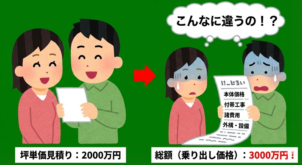 「A社は坪60万、B社は坪70万。だからA社が安い」という比較は、全く意味がありません。