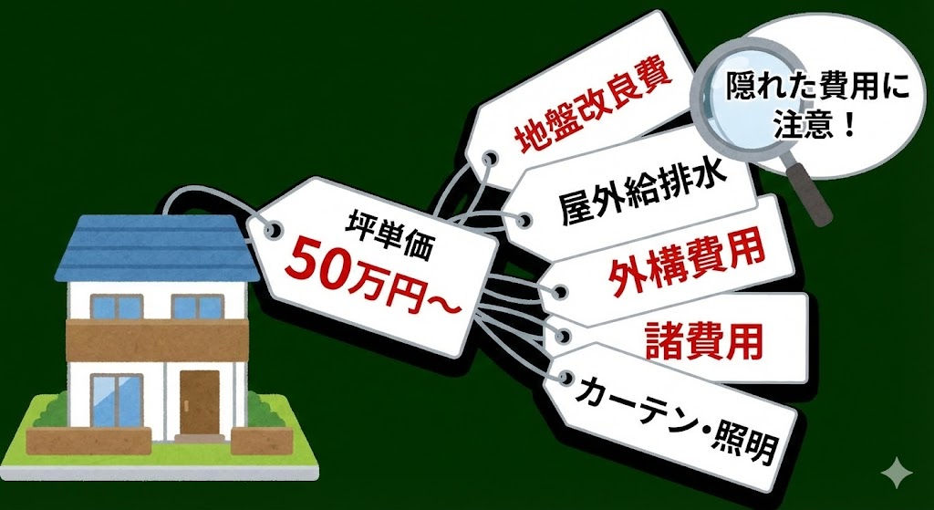 住宅広告に載っている「坪単価」や「建物本体価格」は、車で言えば「タイヤとハンドルがついていない車体の価格」のようなものです。それだけでは生活できません。