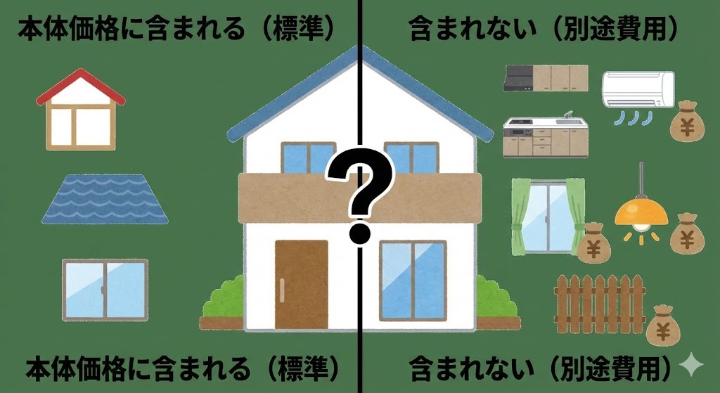 坪単価に含まれる設備もバラバラです。 照明、カーテン、エアコンが含まれている会社もあれば、**「キッチンすらオプション扱い」**で、箱だけの価格を表示している会社もあります。