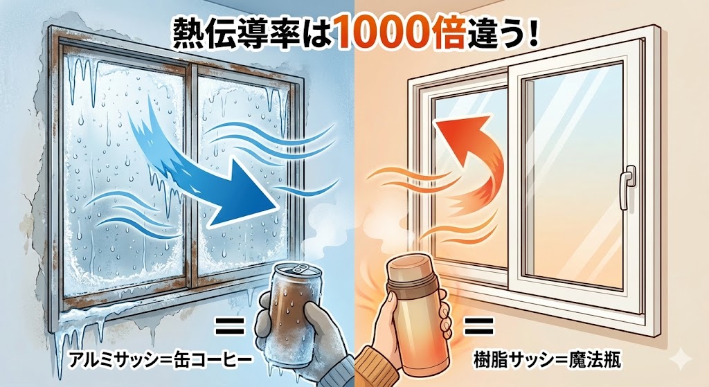 - 冬のアルミサッシ: 外の冷気をそのまま室内に伝え、キンキンに冷えた「冷却装置」になります。