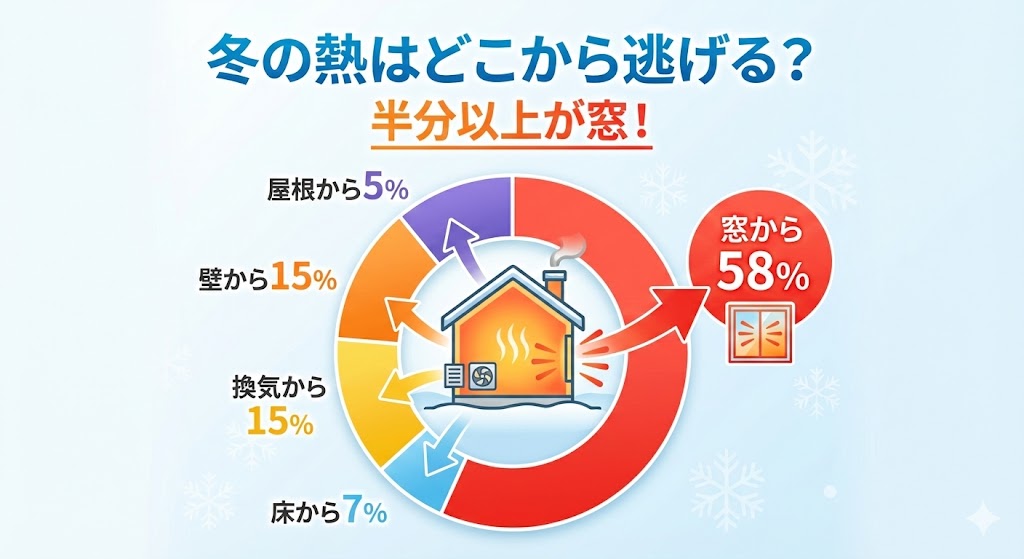 まず、衝撃的な事実を知ってください。 冬場、せっかく暖房で温めた熱は、どこから逃げていると思いますか?