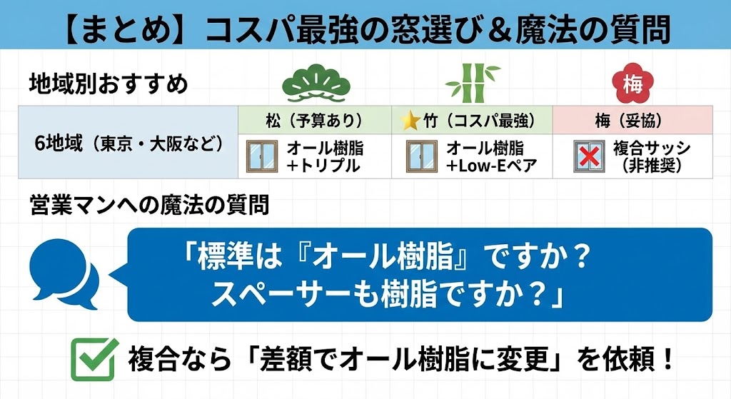- 竹(コスパ最強): オール樹脂サッシ + Low-Eペアガラス(樹脂スペーサー) ←★これが最低ライン!