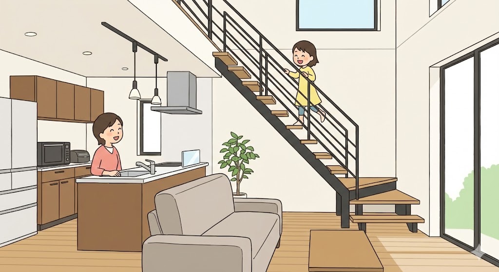 - 音や匂いが伝わりにくい: リビングでテレビを見ていても、2階の寝室まで音が響きにくい。キッチンの料理の匂いも2階に上がりにくい。